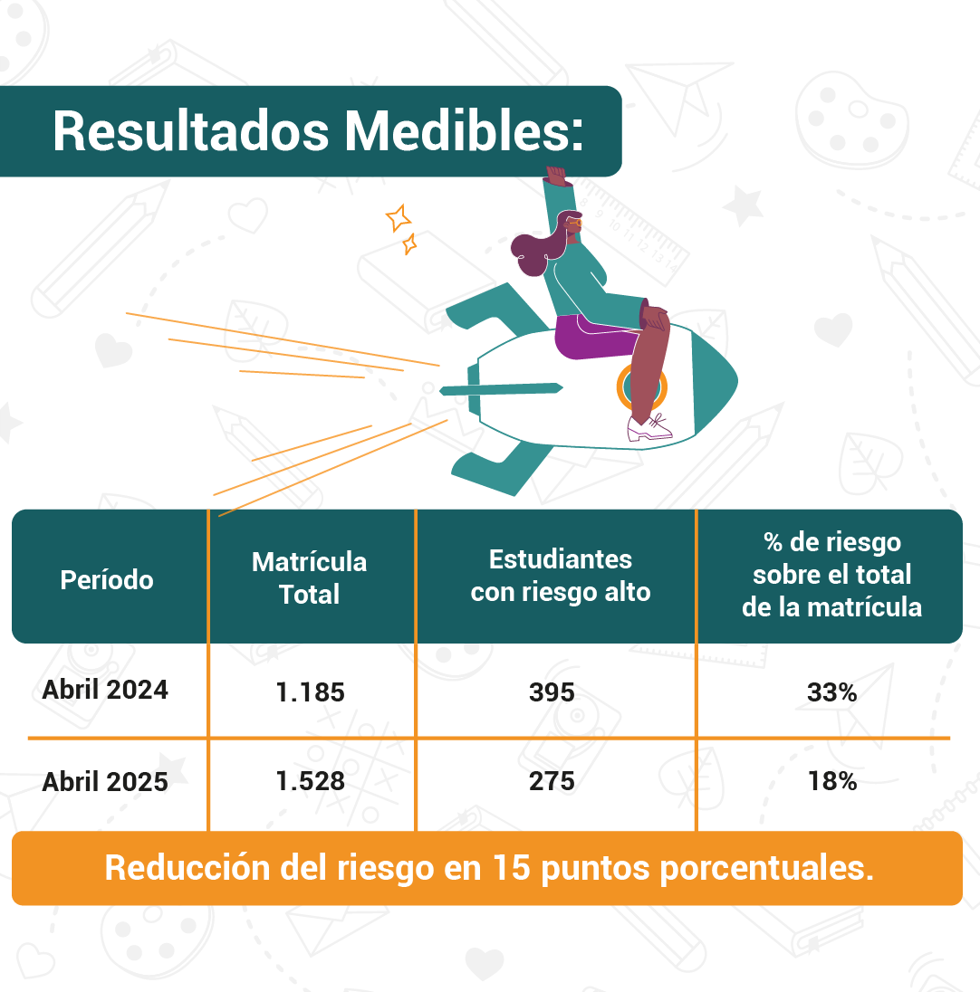 Así, las intervenciones pedagógicas de nuestros docentes se han concentrado en los casos con mayor probabilidad de abandono, basándose en la evidencia disponible y alineándose con los estándares internacionales de COGNIA.