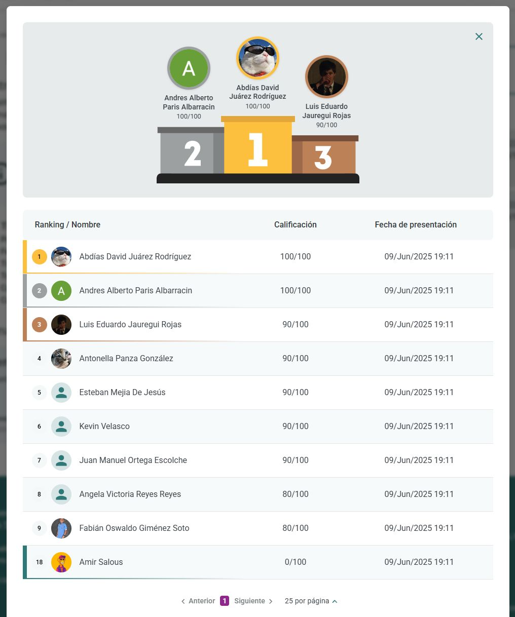 Con el fin de reconocer el esfuerzo y motivar el logro de nuevas metas, ahora se visualizará la posición de los estudiantes en los rankings de cada evaluación.