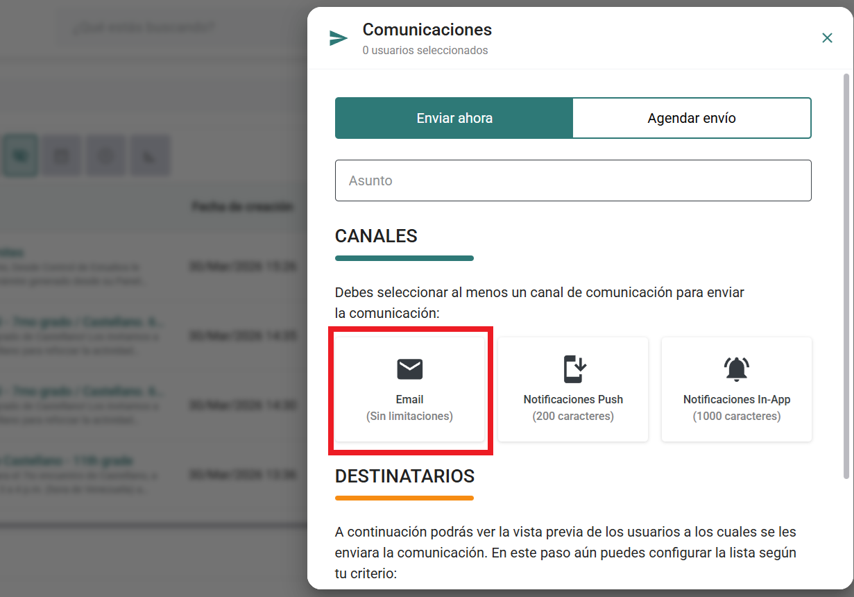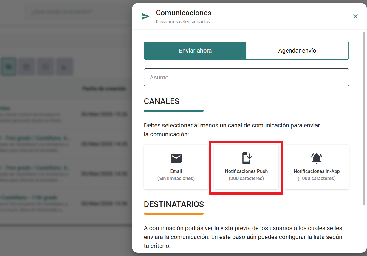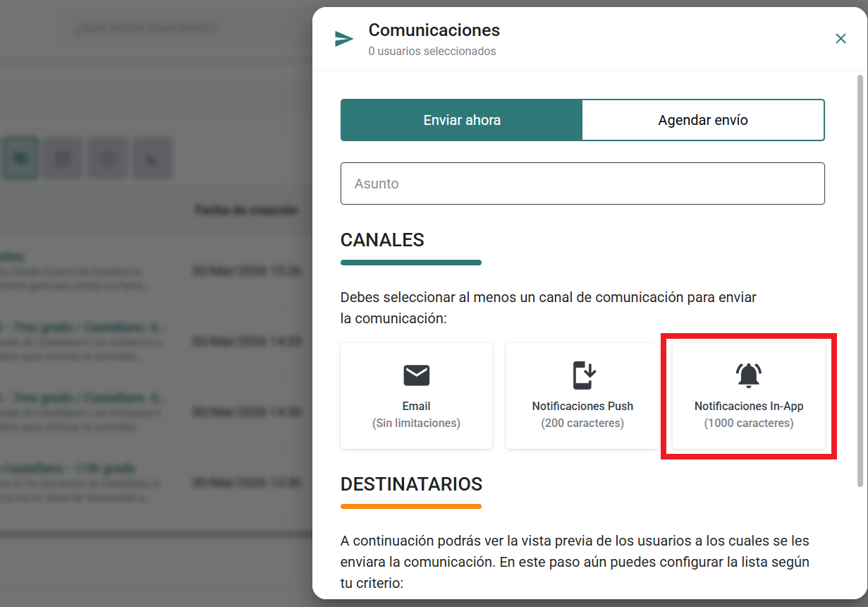 Mensajes in-app (en la plataforma):