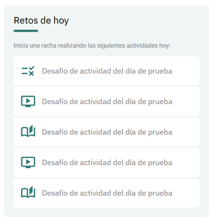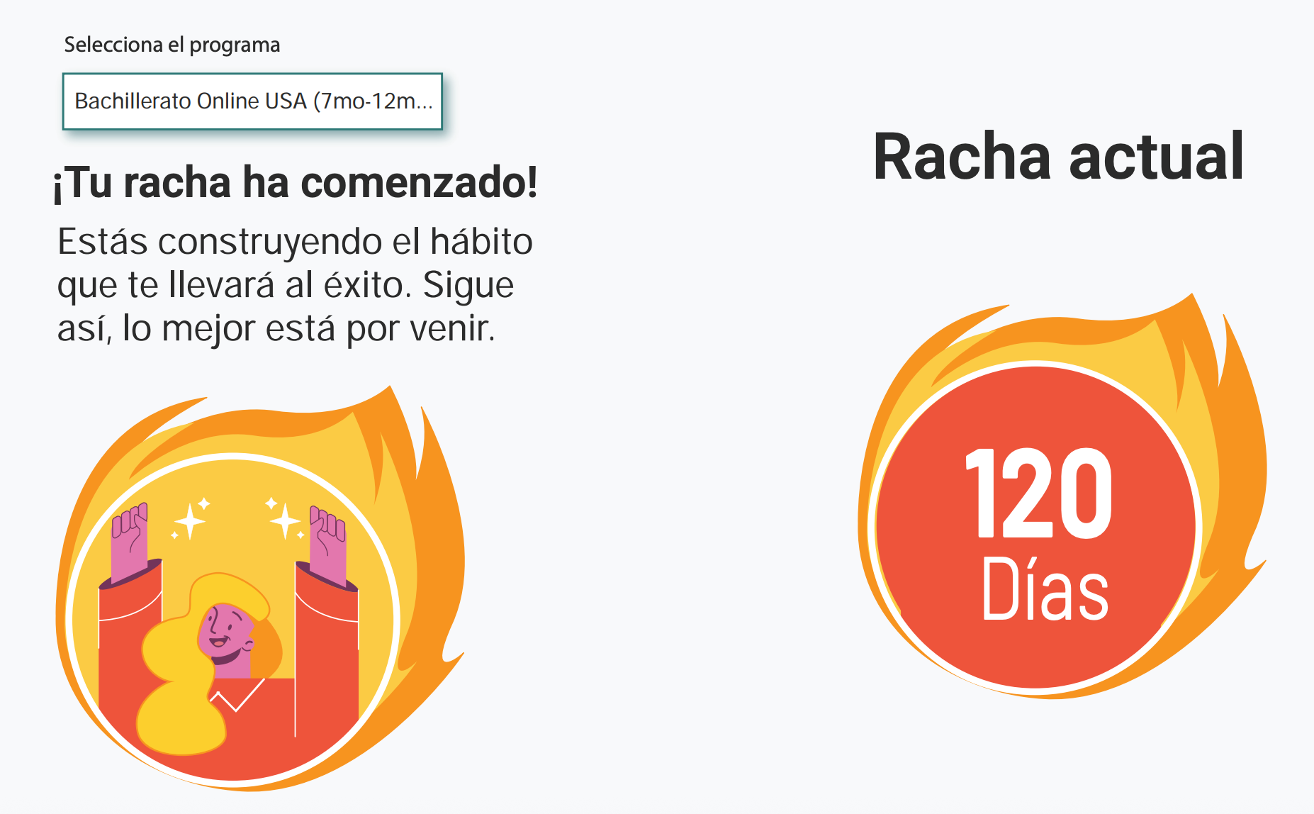 Cada día que el estudiante completa todos los retos del día, suma un día a su racha. El objetivo es construir el hábito de entrar a la plataforma todos los días para favorecer la retención del conocimiento. Las rachas se contabilizan de lunes a viernes sin embargo, la plataforma presenta retos todos los días.