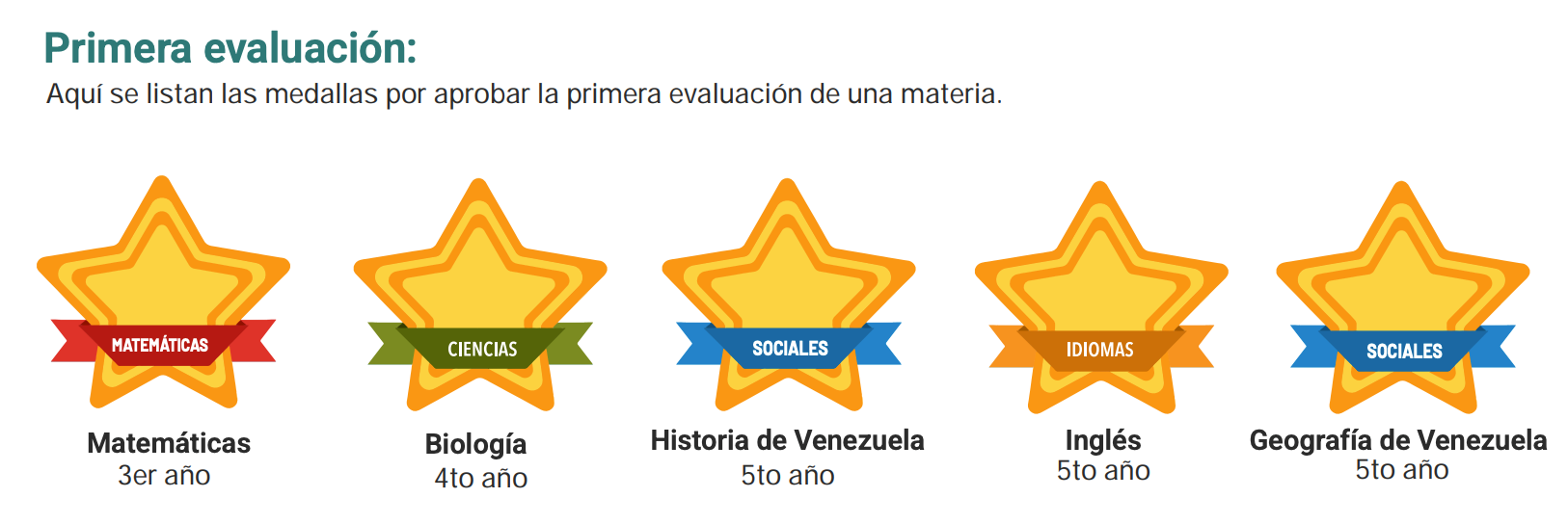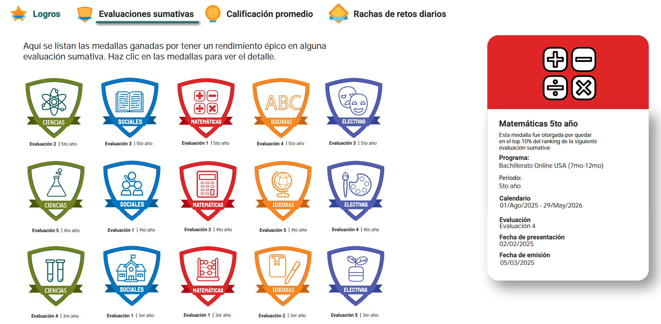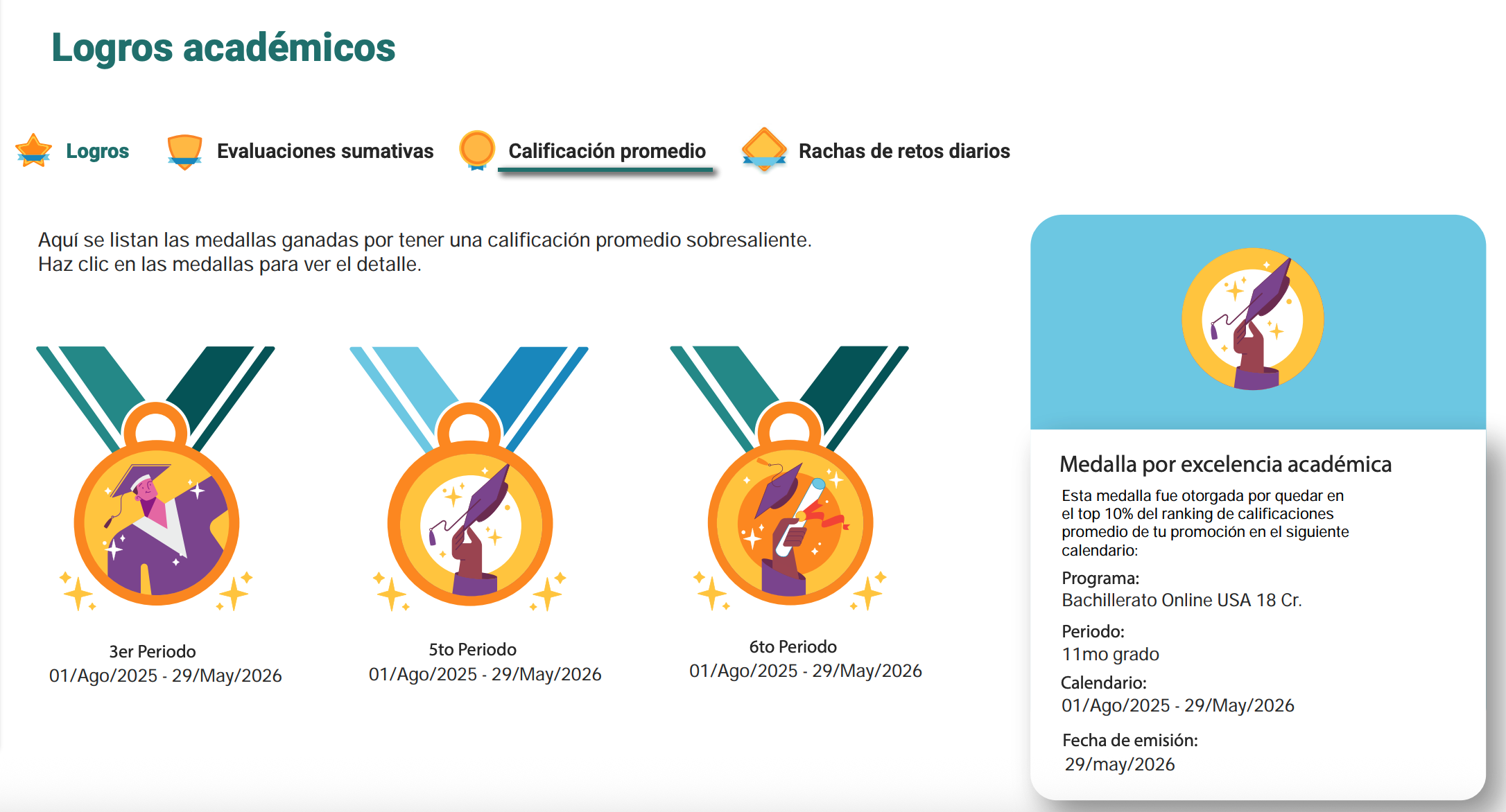 Además de la racha, el estudiante obtiene medallas por hitos que refuerzan el esfuerzo y el desempeño. Entre ellas: aprobación de la primera evaluación de una materia, mantener una materia “al día” sin atrasos, participación destacada en foros, posición de top 10% en evaluaciones sumativas y excelencia por promedio de calificaciones; también reconocimientos por disciplina en rachas. Estas medallas se registran con detalle (materia, periodo, fecha, evaluación) y son visibles en el historial académico.